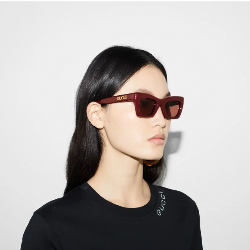 这款酒红色太阳眼镜甄选光泽感醋纤材质打造而成。镜腿缀饰金色调手写体Gucci细节,令长方形镜框魅力更添,纯棕色镜片则令整个设计愈发亮眼