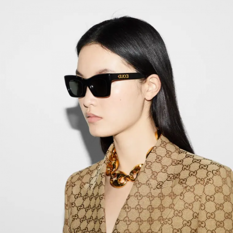这款黑色太阳眼镜甄选光泽感醋纤材质打造而成。镜腿缀饰金色调手写体Gucci细节,令长方形镜框魅力更添,纯灰色镜片则令整个设计愈发亮眼。